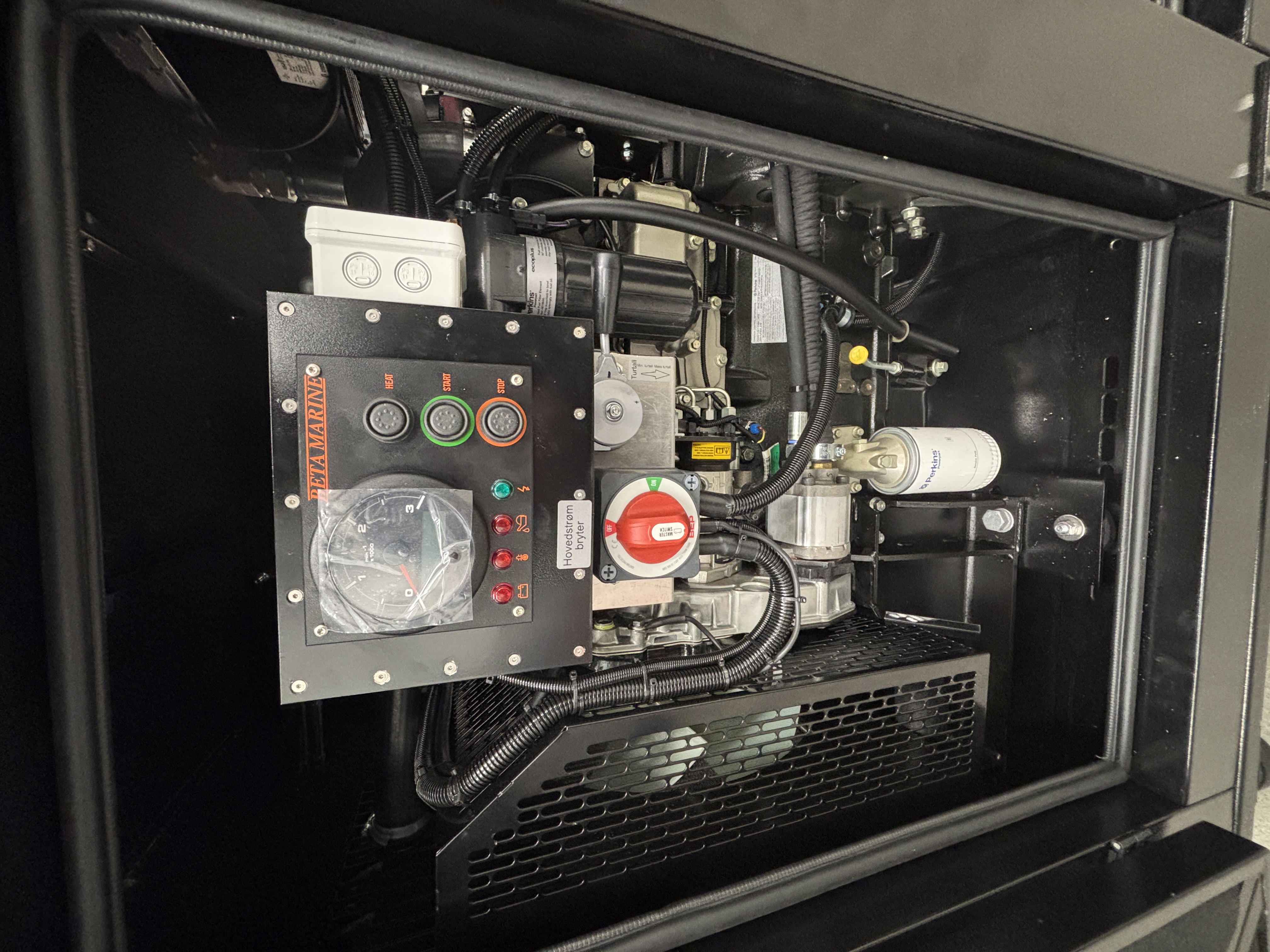 Start panel med turtall, timeteller, lampe/alarm for lavt oljetrykk/høy temp og for lade feil.